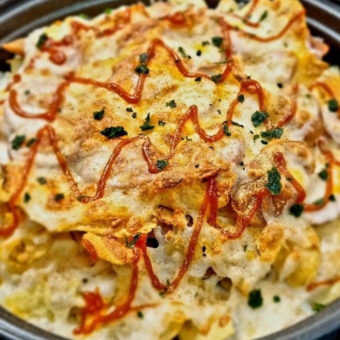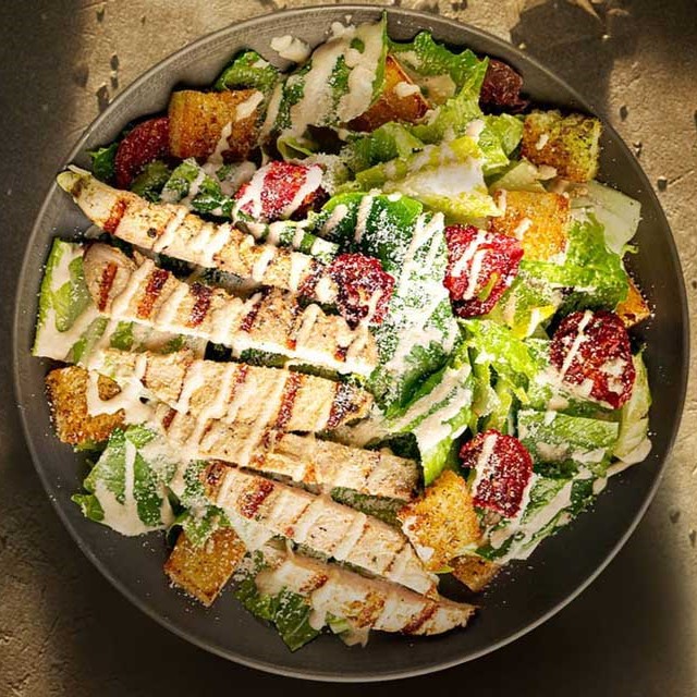 مرغ طمع دار شده، نان گریلشده، پنیر مخصوص، سس مخصوص، دورچین