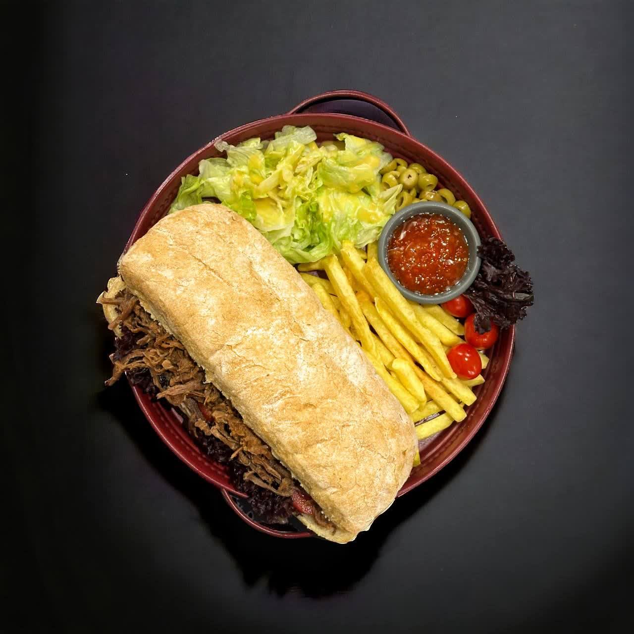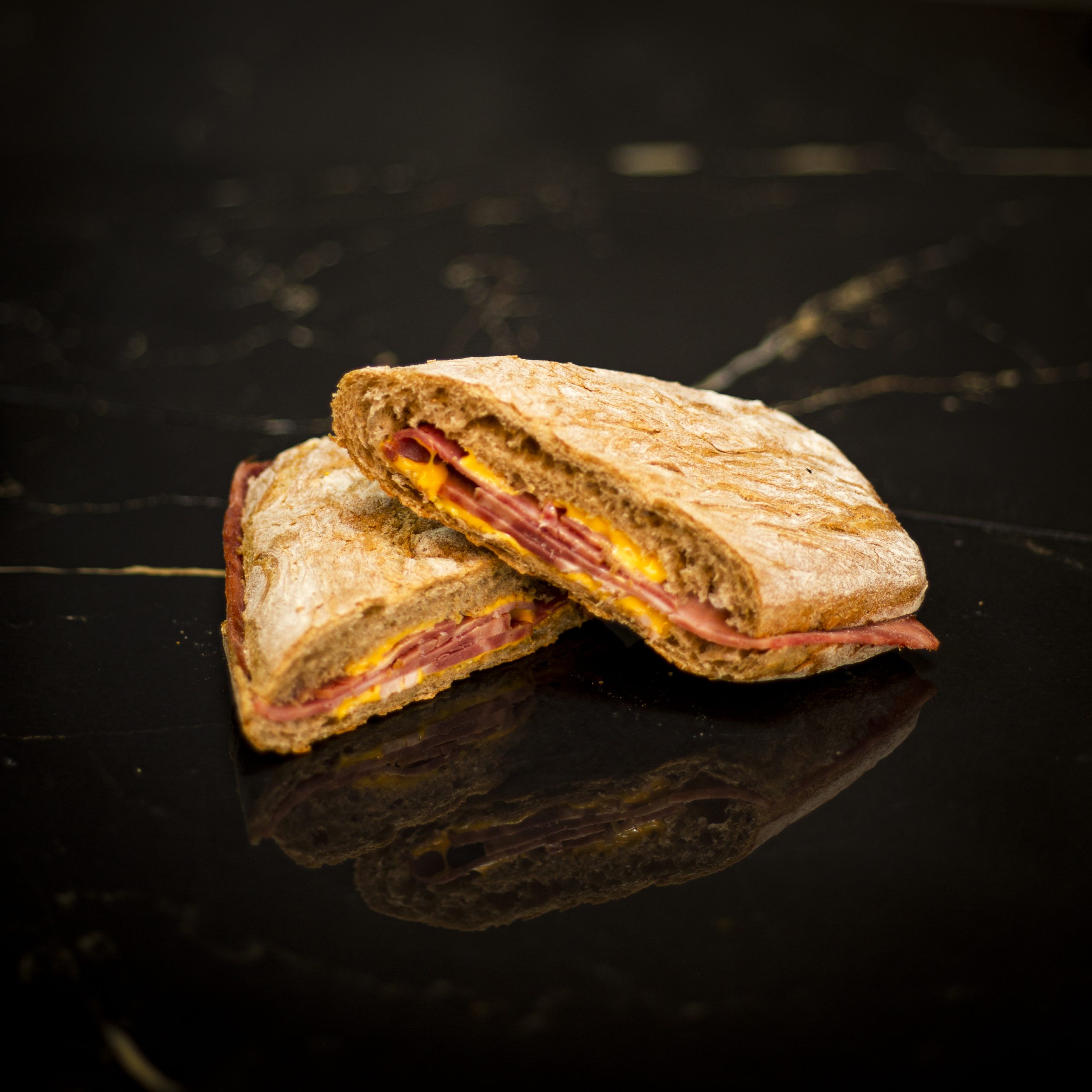 ژامبون، نان گریلشده، پنیر مخصوص، سس مخصوص، دورچین